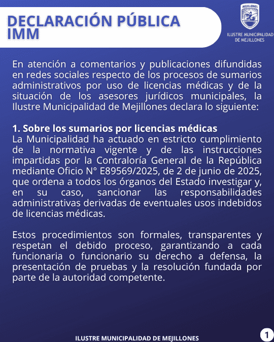 En atención a comentarios y publicaciones difundidas en redes sociales respecto de los procesos de sumarios administrativos por uso de licencias médicas y de la situación de los asesores jurídicos municipales, la Ilustre Municipalidad de Mejillones declara lo siguiente: