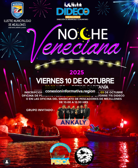 ¡No te pierdas esta mágica noche llena de tradición y encanto junto al mar! Invita Municipalidad a través de Fomento Pesca y Sector pesquero artesanal de Mejillones.